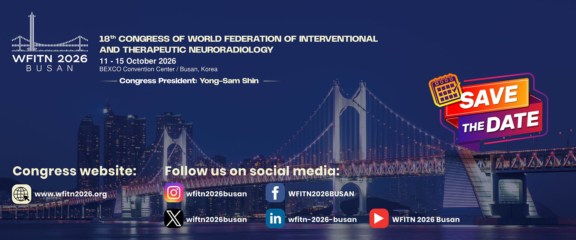 On behalf of the Organizing Committee, it is my great pleasure to invite you to the 18th Congress of the World Federation of Interventional and Therapeutic Neuroradiology (WFITN), to be held in Busan, Korea, in 2026.